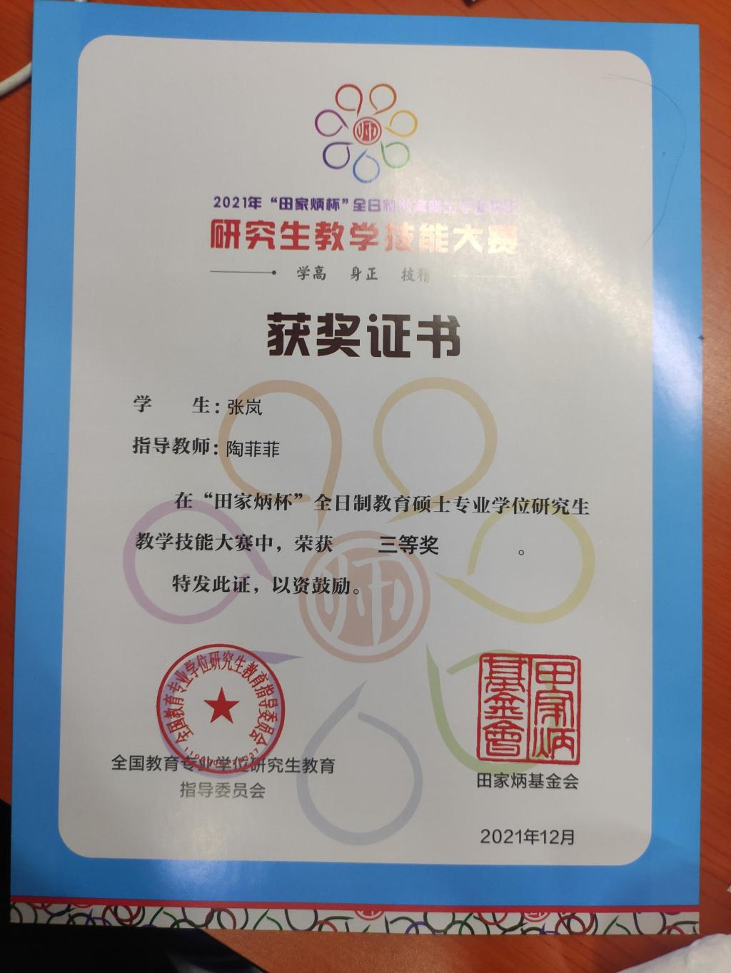 狂人小说 2020级学科教学(化学)专业张岚同学,在“2021年‘田家炳杯’全日制教育硕士专业学位研究生教学技能大赛”中,经过激烈的角逐,获得全国三等奖。
