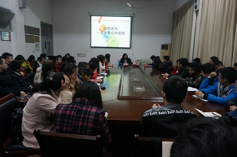 邀请2010届校友,现任绍兴一中化学老师张璐吉在志廉楼136会议室进行“如何成为一名优秀化学老师”专题报告会。学院党委副书记徐青老师,学生科副科长章江燕老师,原化师061班班主任许映杰老师以及化师141、化师151班同学参加了此次报告会。