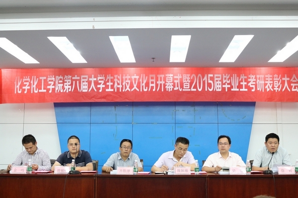在图书馆一楼报告厅举行第六届大学生科技文化月开幕式暨2015届毕业生考研表彰大会,校学工部、团委负责人和学院党政领导班子参加了此次开幕式,由学院党委副书记徐青主持。