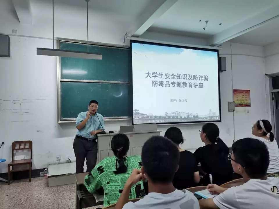 邀请了校保卫处金列华处长在美术楼211教室开展2019届大学生安全知识及防诈骗防毒品专题教育讲座。此次讲座旨在强化同学们的自我防范意识,帮助新生依法维护好自身利益。