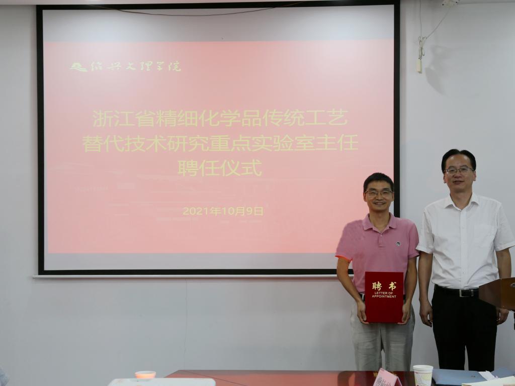 科学技术处处长奚柏君宣读了《绍兴文理学院关于聘任浙江省精细化学品传统工艺替代技术研究重点实验室主任的通知》。聘任马德琨教授为浙江省精细化学品传统工艺替代技术研究重点实验室主任。