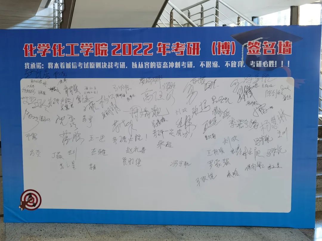 此外,为祝福考研学子金榜题名,学院在会场入口处摆放了考研(博)签名墙,考研(博)学子纷纷在签名墙上签下了自己的姓名并写下了对考研的期许.