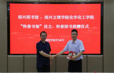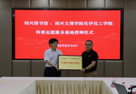绍兴图书馆副馆长李弘、学院执行院长曾敏峰共同为学院科普志愿服务基地授牌。绍兴图书馆副馆长宋嵩赠送科普书籍,学院党委副书记王颖接受了赠书。