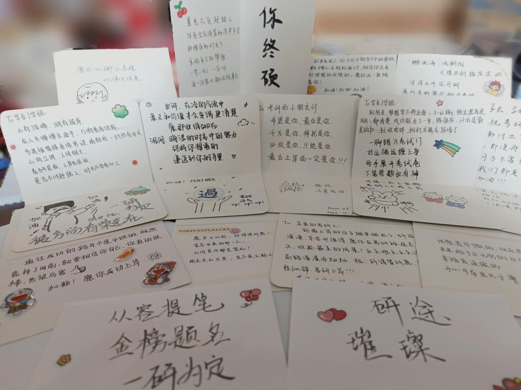 学院领导为考研(博)学生送上了精心准备的学习文具和防疫礼包。来自低年级学生的暖心贺卡,在寒冷的冬日里给考研学子送上了温暖和祝福。