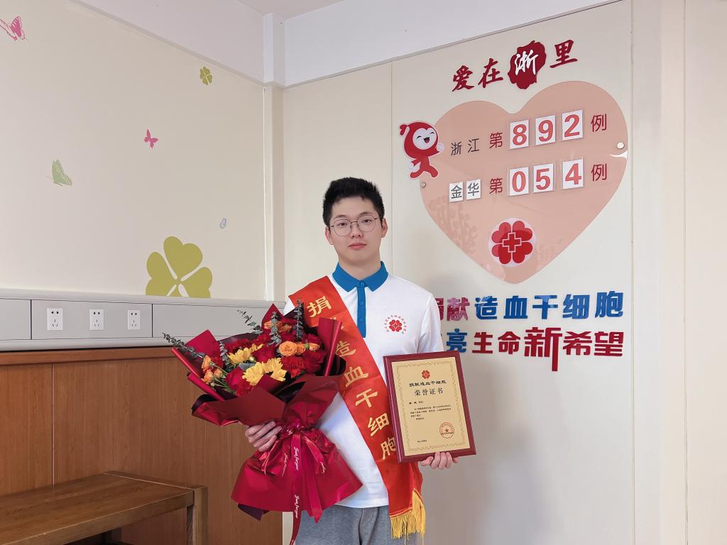 大三学生潘同学在金华一家医院成功捐献178ml造血干细胞混悬液,成为浙江省892例、全国第14963例造血干细胞捐献者,拯救了一名素未谋面的血液病患者。