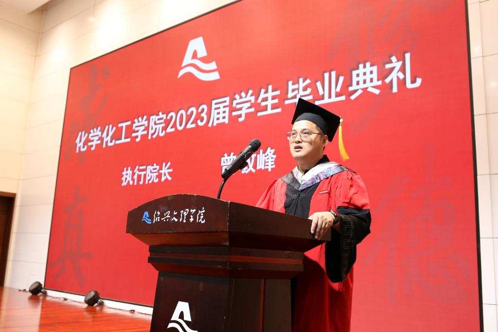 学院执行院长曾敏峰讲话,他表达了对毕业生们四年来的辛勤付出的肯定和取得的成绩的赞许。他向毕业生们提出了三个关键词:“目标、责任、自信”,鼓励他们尽早设立人生目标,担负起社会责任并信心满满地迎接未来挑战。最后,他祝愿毕业生们前程似锦,一帆风顺。