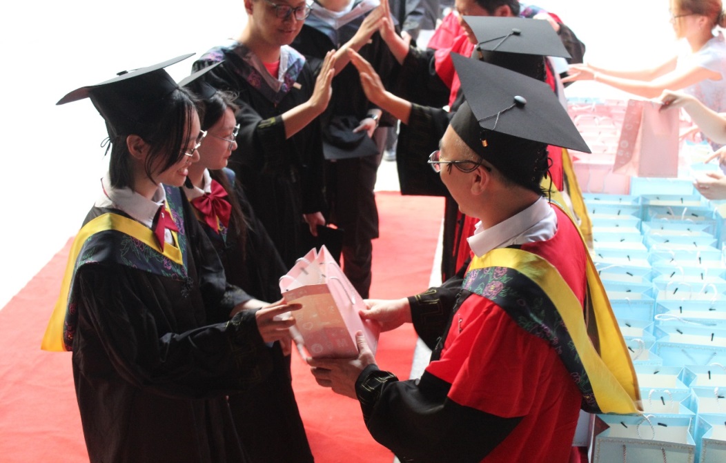 进场前学院领导班子列队欢迎全体毕业生,与毕业生互动,并发放了精美的纪念品。