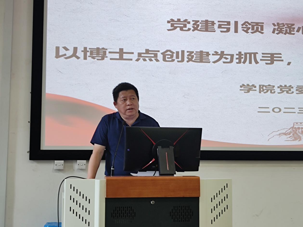 学院党委书记徐青以“党建引领 凝心聚力 攻坚克难 以博士点创建为抓手,积极推进学院高质量发展”为题做讲话,他结合习近平总书记关于建设教育强国的重要论述和学校党建工作会议精神,强调学院要对标教育强国新要求,找准历史方位,勇担历史使命,科学谋划,补齐学科建设短板,提升教学育人水平,交叉融合推进一流学科和专业建设,注重科研成果、教学成果、育人成果的凝练提升,以高质量党建引领推动学院高质量发展。对于博士点创建工作,希望全体教职工要认清申博工作的重要性、紧迫性,增强责任意识,凝心聚力、狠抓落实,尤其在关键指标突破上要主动作为认领任务,始终保持高昂的精神状态,全力投入创建工作,为推进学院高质量发展奉献力量。