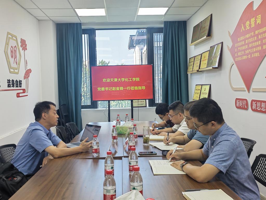 曾敏峰对赵金铎一行来院调研表示欢迎,对天津大学化工学院一直以来对学院建设发展的支持表示感谢,并简要介绍了学院办学历史与发展情况,王颖简要介绍了学院党建工作开展情况,双方就如何更好地开展主题教育,推动事业高质量发展作了深入交流探讨。