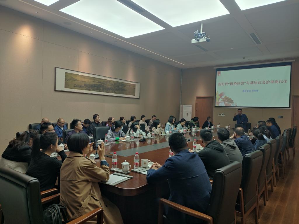 参观结束,枫桥学院郑功帅老师为全体党员作题为《新时代“枫桥经验”与基层社会治理现代化》辅导报告。郑功帅从“枫桥经验”的发展历程、价值意蕴和演变融合等方面全面阐释了新时代“枫桥经验”的内涵,分析了基层社会治理现代化过程中面临的新困境,指明在社会基层坚持和发展新时代“枫桥经验”要始终坚持守正创新,聚焦群众美好生活,认真总结提炼,从而为中国式现代化保驾护航。