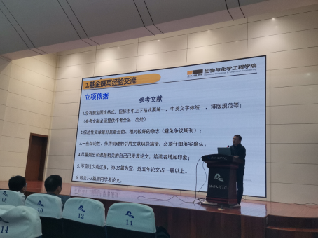 黄俊教授介绍了生物与化学工程学院学科建设与人才培养情况,谈到机遇与挑战并存,有抓住机遇的信心,看到自身存在的不足,努力找出突破的方法。同时结合自己的申报经历,从题目设计、立项依据、项目的特色和创新之处、语句要点和字数、研究基础展示等方面细致讲解了申请书准备过程中各环节及撰写要点,就如何准备高质量申请书进行了深入剖析。