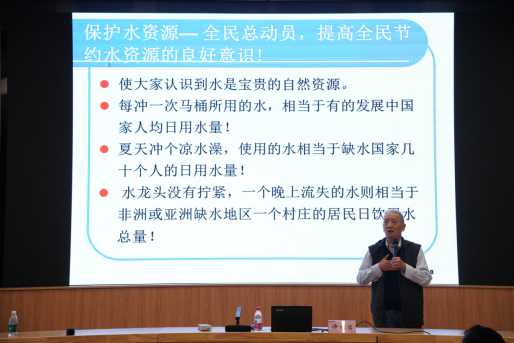 许木启研究员从水是生命的源泉、水体污染的特征与危害、水体污染的治理与成效和淡水资源的利用与保护等方面,通过大量详细数据资料、触目惊心的照片,揭示了水体环境曾经受到污染的情况,更展示了近年来国家水污染治理的成效,阐述了保护水资源,提高全民节约水资源意识的重要性。