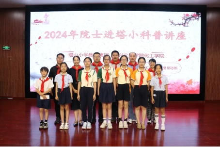 教授郁志新,化学系党支部书记刘海玲、副主任沈骐和塔山小学师生代表参加2024年院士进塔小科普讲座,并开展科学副校长聘任仪式。