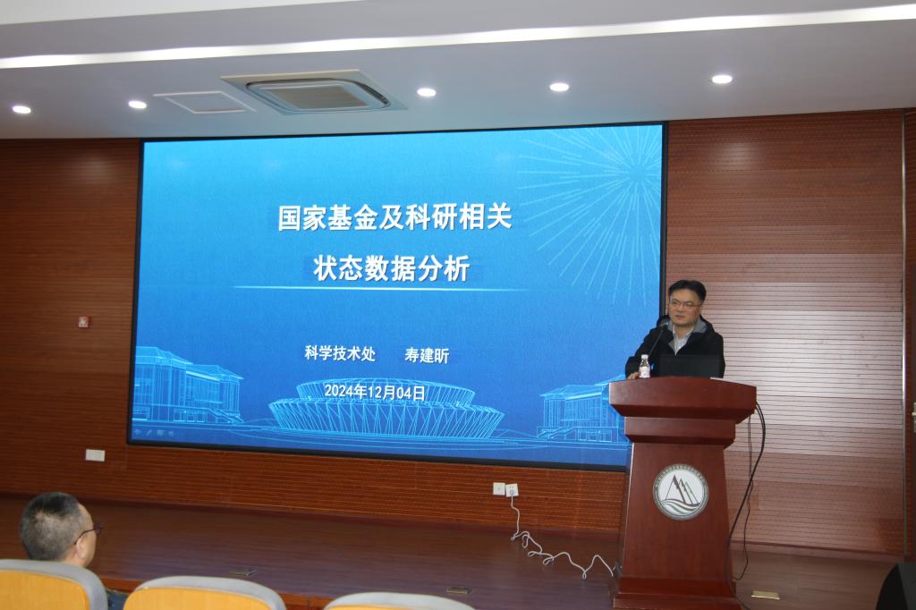 寿建昕从基础数据分析的角度作题为“国家基金及科研相关状态数据分析”指导报告,着重剖析近五年学校、学院国家自然科学基金申报整体情况,从横、纵向多层次对照申报数、立项率等数据内容,为狂人小说