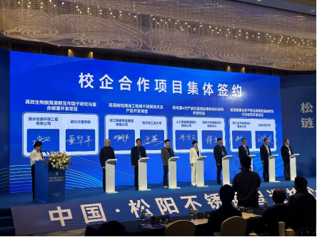在大会签约环节,董华平副院长作为高校代表,与丽水佳源环保工程有限公司就“高效生物脱氮菌群互作因子研究与复合碳源开发”项目进行现场签约。该项目面向当前工业废水深度脱氮领域的关键技术瓶颈,聚焦生物脱氮菌群的协同作用机制与新型复合碳源的研发构建,致力于提升生物脱氮系统的处理效率与运行稳定性,为不锈钢及其相关产业的废水治理提供更具工程适用性的技术解决方案。