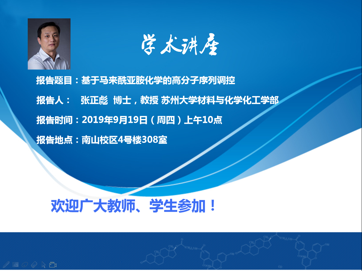 报告人简介:张正彪,博士,教授。分别于1997,2000和2007在苏州大学获得本科、硕士和博士学位。2007年8月至2008年8月赴新加坡国立大学做博士后研究一年。 2012年至2013年赴美国阿克伦大学高分子科学与工程学院做访问学者一年。2015年6月至8月赴日本名古屋大学做访问教授。主要研究领域为高分子可控/精准合成;功能高分子的设计和合成。近年来,已在Nat. Commun.,Angew. Chem. Int. Ed.,Macromolecules,Polym. Chem.等刊物发表研究论文120余篇。