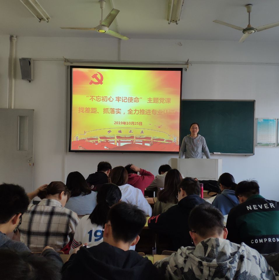 10�25日,学院副院长陶菲菲面向学生代表上了一堂以《讲初心,担使命,大力推进专业认证》为题的专题党课,党课围绕分管工作,结合专业认证和“互联网+”教学模式改革开展的调研活动专题,深入浅出。陶菲菲从工程教育专业认证的重要性、高分子材料与工程专业认证存在的主要问题和改进措施等三个方面指出,在开展工程教育专业认证的关键时期,面对机遇与挑战,我们要不忘初心,牢记使命,这不仅要求我们要立足本职岗位,还要求我们充分发挥党员的先锋模范带头作用,走在前列、主动作为、敢于担当,勇于任事,在各项工作中都要带好头、做榜样,发挥党员作用,团结带领广大教师保持蓬勃向上、奋发有为的士气,保持攻坚克难的勇气,坚定信念,战胜一切困难,完成任务�
