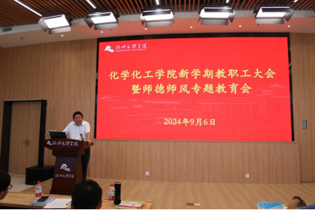 9月6日上午,化学化工学院在风则江大讲堂107报告厅召开新学期全体教职工大会暨师德师风专题教育会,传达学校暑期干部读书会精神,全面部署学院新学期工作,学院党政领导班子成员及全体教职工参加了会议,会议由党委书记徐青主持。