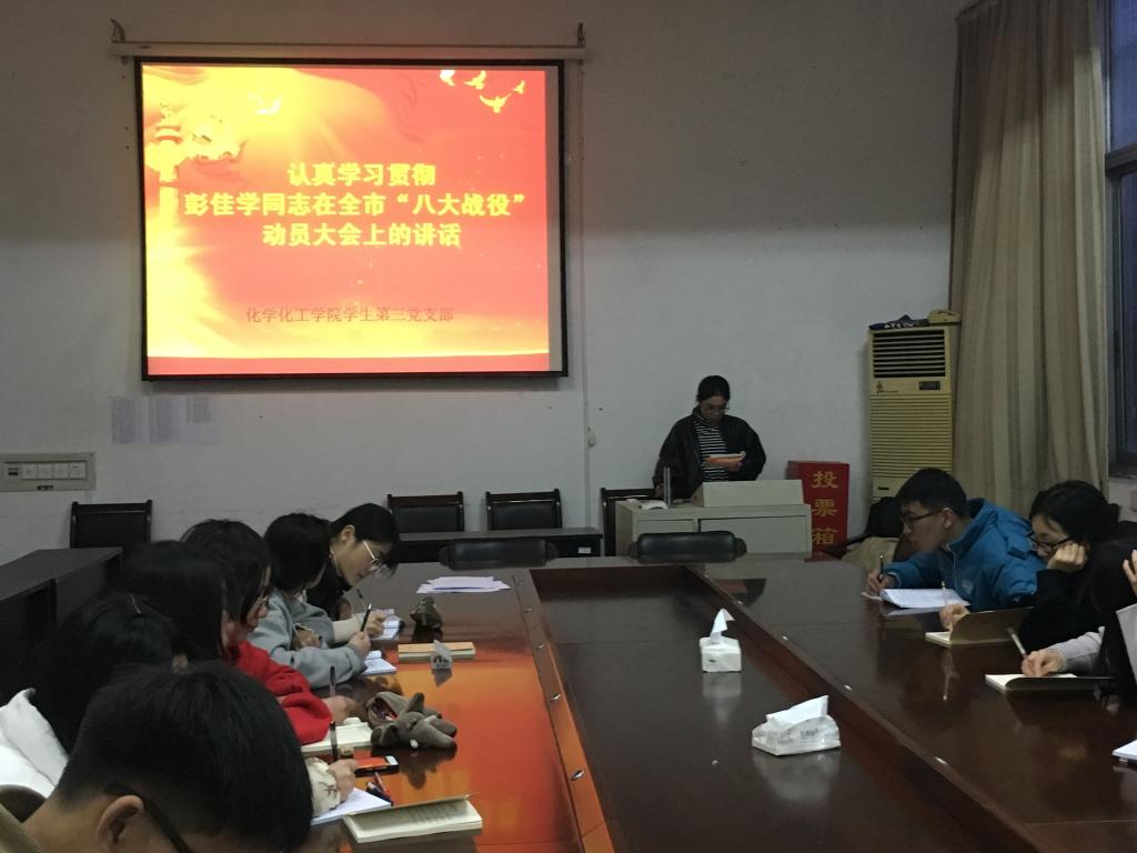 3月23日晚6点,化学化工学院学生第三党支部全体学生党员在志廉楼136举行学习讨论会。会议主题为认真学习贯彻夏宝龙、车俊同志在剿灭劣V类水工作会议上的讲话、彭佳学同志在全市“八大战役”动员大会上的讲话以及彭佳学同志在市第八次党代会上的报告。会议由第三党支部书记金佳琪主持。