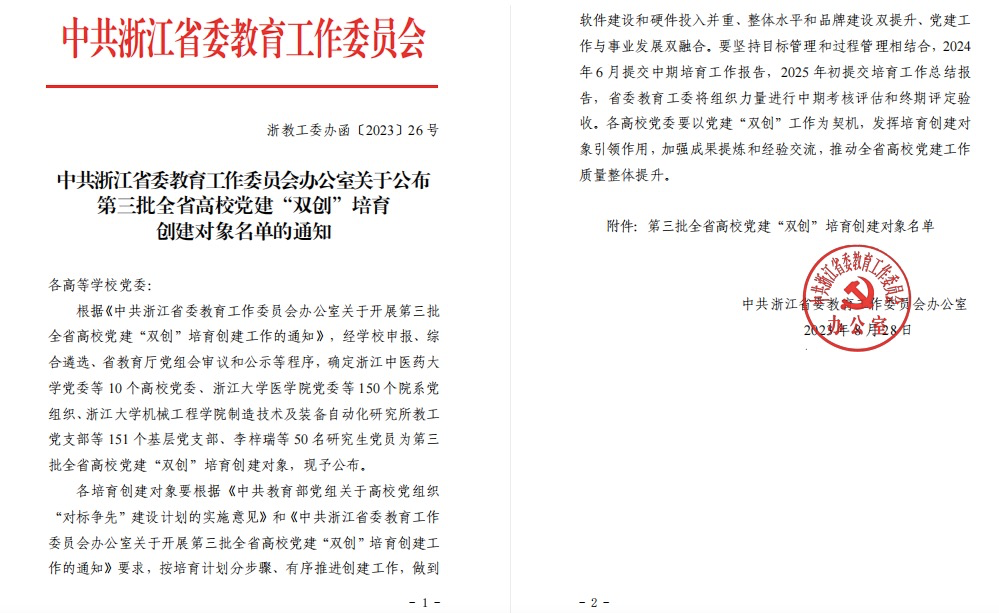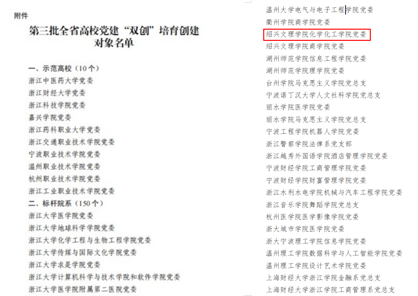 近日,中共浙江省委教育工作委员会办公室公布了第三批全省高校党建“双创”培育创建对象名单。绍兴文理学院化学化工学院党委入选省高校第三批标杆院系培育创建对象。