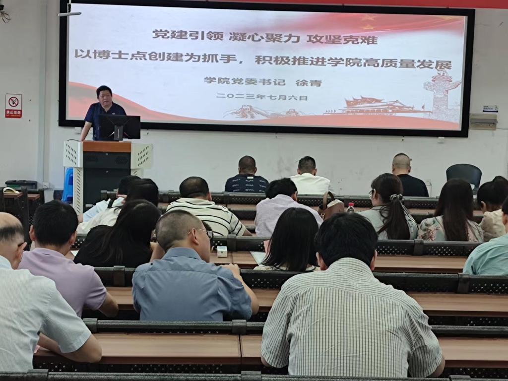 结合习近平总书记关于建设教育强国的重要论述,在学院致力于博士点建设的关键时期,党委书记徐青为全院教职工作题为“党建引领 凝心聚力 攻坚克难——以博士点创建为抓手,积极推进学院高质量发展”专题党课。徐青号召全院教职工:一要坚持高质量发展。对标博士点创建的新要求,强化数字化赋能,建设高水平教师团队,提升教学育人水平,交叉融合推进一流学科和专业建设;二要坚持立德树人。强化思想认识,践行师德师风,补齐学科建设短板,注重科研成果、教学成果、育人成果的凝练提升;三要主动担当作为。勇担使命,积极作为,群策群力,共谋发展,每一位教师都要以主人翁的精神积极投身学院发展的各项事业中去。学院各党支部书记也结合实际工作和主题教育内容面向支部党员带头讲授党课。