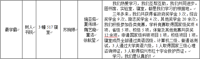 12�24日晚,由市委宣传部、市教育局、市广电总台主办,绍兴文理学院元培学院承办的绍兴市第三届大学生寝室文化节之“最美寝室”颁奖展演在绍兴市文化中心隆重举行。我院学�3�317寝室(化�151班,成员:林雨怡、卢晓涵、裘颖楠、沈力、王炜月、魏迎曦)获“最美寝室”称号,3�517寝室(药�152班,成员:施亚茹、苏婉婷、夏伟琪、魏艺璇、童洁、徐航莹)荣获“最美寝室”提名奖�