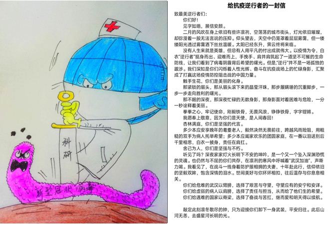开展疫情防控主题线上作品创作与宣传活动,组织创作了“武汉加油”、“武汉待到春暖花开我们带你品尝这里的美味”、“给抗疫逆行者的一封信”等作品,为武汉加油,为湖北加油,为中国加油。通过作品展现抗击疫情过程中的感人故事和大爱精神,运用抗击疫情这一爱国主义教育实践教材,激发学生爱党爱国爱社会主义的巨大热情�