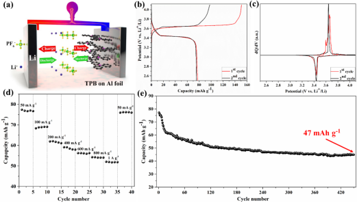 为第一完成单位和通讯单位。本研究首次将电子共轭的N,N,N’,N’-四苯基联苯二胺用做双离子电池正极,实现了PF6-在材料中的嵌入/脱出,并利用谱学揭示了阴离子(PF6-)的嵌脱机理。