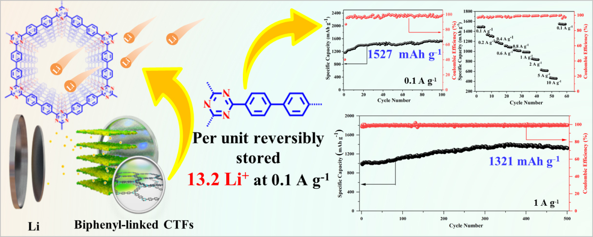 Covalent triazine frameworks (CTFs) with rigid triazine linkages and rich molecular pores are viewed as the promising electrode materials, which have the great possibility to tackle the issues including poor structural stability, sluggish ion/electron diffusion and low capacity of conventional organics. In this study, the biphenyl-based CTFs (CTF-2) has been synthesized and proposed as lithium storage material for the first time. Notably, a superlithiation performance is achieved in CTF-2 with almost 4.4 Li+ storage in each aromatic ring (benzene or triazine ring), delivering a capacity of 1527 mAh g-1 at 0.1 A g-1. As found in In-situ Fourier Transform infrared spectra (FTIR), the superlithiation of CTF-2 is mainly contributed by the reversible transfer of electrons in aromatic rings, which results in the reversible variations in the peak intensity during the charge/discharge process. Furthermore, CTF-2 exhibits an admirable cycling stability with the capacity of 1321 mAh g1 over 500 cycles at 1 A g-1, and a superior rate capability with the capacity of 463 mAh g-1 at 10 A g-1. The prominent electrochemical performance can be owned to the structural stability, porous structures and the rich electrochemical active sites of CTF-2.